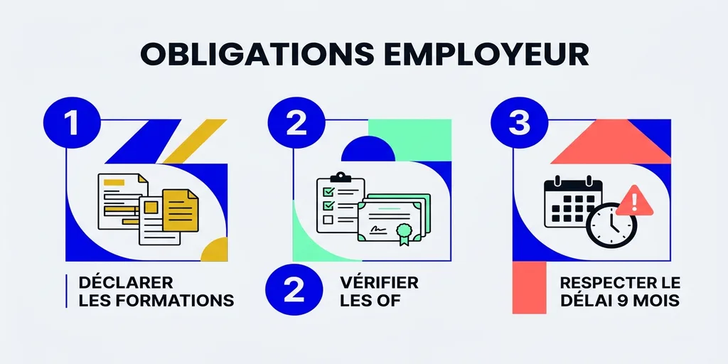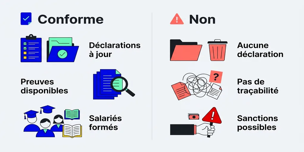 De plus, son réflexe : il a créé un tableau récapitulatif par salarié (nom, formation, date, OF ou interne, déclarée oui/non). Ce tableau lui sert de suivi et de preuve en cas de contrôle pendant la montée en charge du dispositif. 🎯