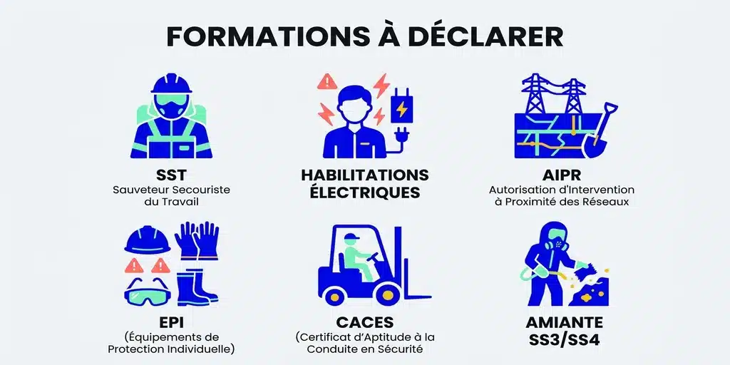 - Septembre 2025 : ouverture de l’espace pour les organismes de formation. Ils déclarent les formations SST, habilitations électriques, CACES et autres certifications qu’ils dispensent.